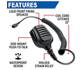 Diseñado para durar en entornos extremos como policía, bomberos/seguridad, servicios de emergencia, seguridad, carreras, industria, seguridad, operadores de equipos pesados y otros lugares donde necesita ser escuchado.